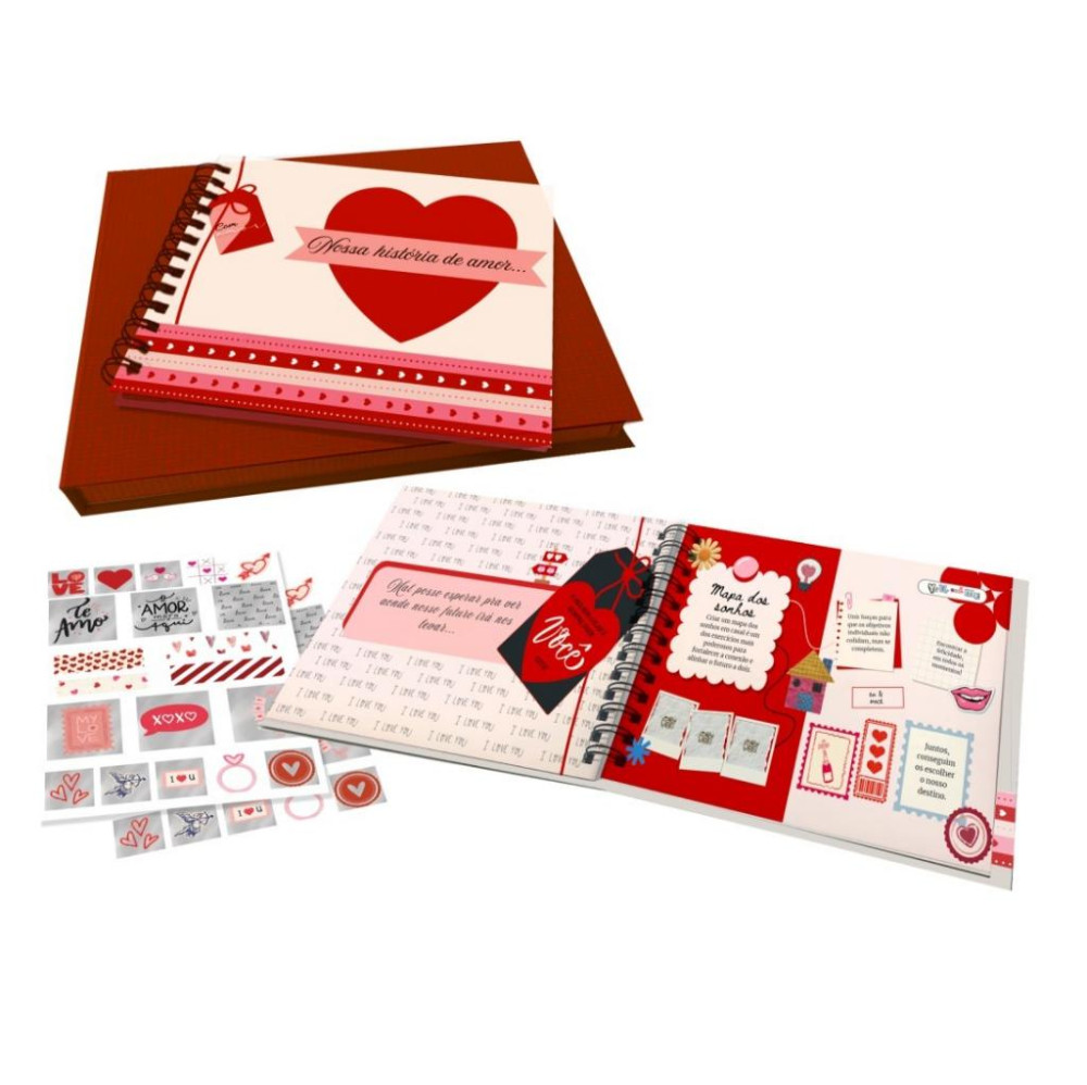São 30 folhas, frente e verso, com espaço para colar fotos (de tamanhos variados), passagens, ingressos e todas as lembranças que contem a história do relacionamento. Embalagem rigida. Acompanha duas cartelas de adesivos para recortar.